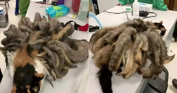 Στην κλινική, η σοβαρότητα της κατάστασης έγινε αμέσως φανερή. Οι χοντροί κόμποι στο τρίχωμά της είχαν σκληρύνει σε πλάκες που παγίδευαν βρωμιά, νεκρό δέρμα και ακόμη και έντομα. Περιόριζαν κάθε της κίνηση και σίγουρα προκαλούσαν συνεχή πόνο. Ήταν απαραίτητη μια ελαφριά νάρκωση. Με αργές, προσεκτικές κινήσεις, η ομάδα άρχισε να απελευθερώνει το μικρό της σώμα.