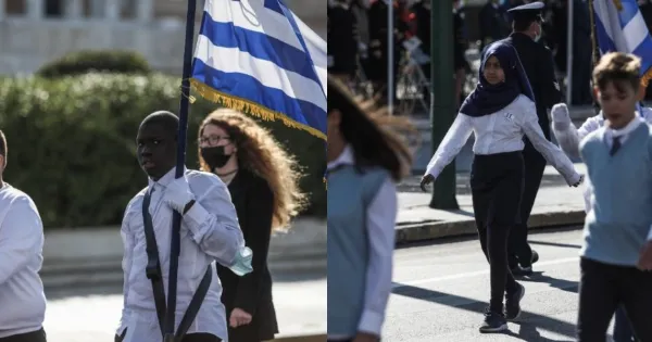 Στην παρέλαση συμμετείχαν επίσης κι άλλα παιδιά τα οποία έλκουν την καταγωγή τους εκτός Ελλάδας, όπως για παράδειγμα το κοριτσάκι από το 11ο Δημοτικό Σχολείο Αθηνών η οποία παρήλασε όλο υπερηφάνεια φορώντας την μουσουλμανική της μαντήλα.
