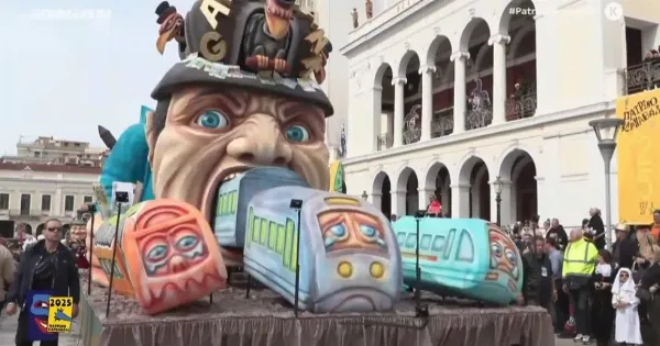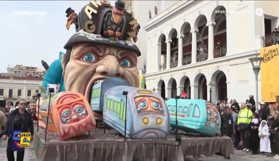 Το πρωτότυπο άρμα που έκανε την εμφάνισή του στη Μεγάλη Παρέλαση της Πάτρας, που λαμβάνει χώρα στην Πλατεία Γεωργίου, απεικονίζει το στόμα ενός τραπεζίτη που καταπίνει το σιδηροδρομικό δίκτυο, ένα πρόβλημα που έχει ταλαιπωρήσει ιδιαίτερα τους κατοίκους.