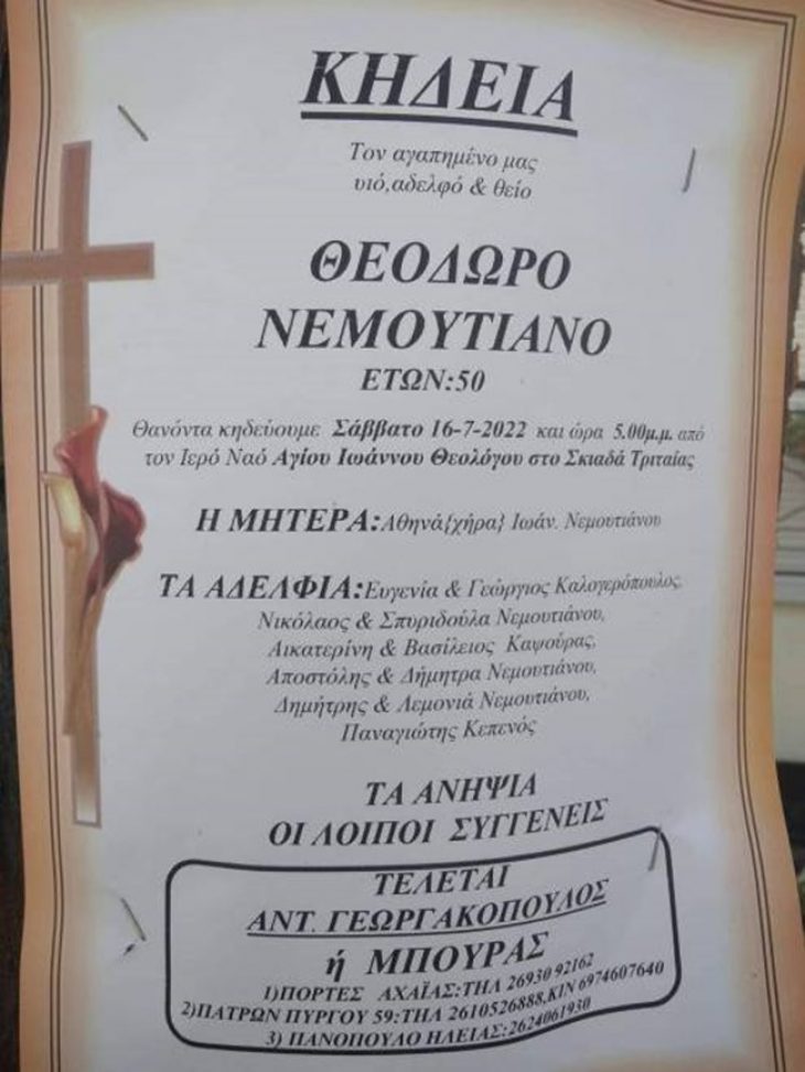 Το τελευταίο «αντίο» θα πουν σήμερα στον 49χρονο Θοδωρή Νεμουτιανού που έχασε τη ζωή του στην Πάτρα συγγενείς και φίλοι.