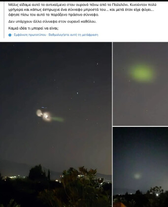 «Ένα δυνατό φώς που έτρεχε γρήγορα και αθόρυβα μέσα σε ένα σύννεφο και μετά από αρκετή ώρα χάθηκε αφήνοντας πίσω του το σύννεφο το οποίο φαίνεται ακόμα. Το βίντεο τραβήχτηκε από τον Πανασό και το χωριό που φαίνεται είναι η Γέργερη. Το είδε κάποιος άλλος?»