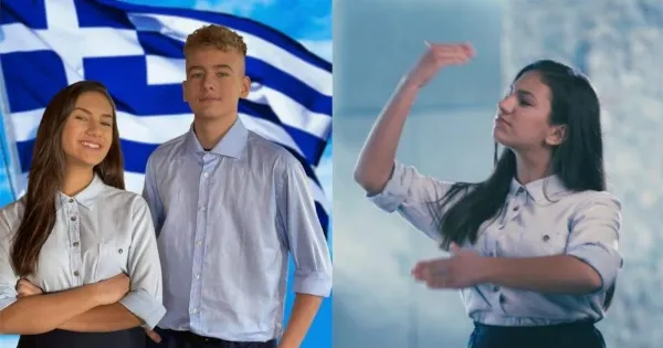 Η Ελευθερία Λαζαρίδου, μαθήτρια της Β’ Λυκείου, και ο Χρήστος Γκανάτσας, μαθητής της Γ’ Γυμνασίου στο Ειδικό Γυμνάσιο-Λύκειο Κωφών και Βαρήκοων Θεσσαλονίκης, ενσαρκώνουν τους πρωταγωνιστές σε έναν εξαιρετικό βίντεο, που αποδίδει, για πρώτη φορά στη νοηματική γλώσσα, τον Εθνικό Ύμνο.