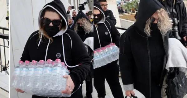 Αίσθηση προκάλεσε η εικόνα της Δήμητρας Πισπιρίγκου να μεταφέρει μια ντουζίνα εμφιαλωμένα μπουκαλάκια νερού μέσα στο κτίριο της ΓΑΔΑ. Μητέρα και αδερφή επισκέφθηκαν την 33χρονη κατηγορούμενη για να της πάνε ρούχα αλλά όπως φαίνεται και μια ειδική παραγγελία.