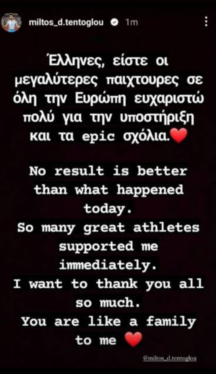 Ο Μίλτος Τεντόγλου, με ανάρτηση του στο Instagram ευχαρίστησε για την υποστήριξη, τόσο όλους τους Έλληνες, όσο και τους συναθλητές του.