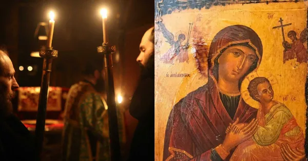 Μόλις κατάφεραν και έσβησαν τη μικρή φωτιά , είδαν έκπληκτοι πως σε εικόνα της Παναγίας, στο σημείο που είχε καεί, εμφανίσθηκε το σημείο του Σταυρού.