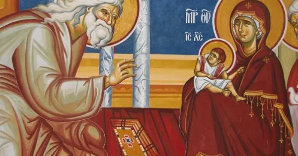Σύμφωνα με τον Μωσαϊκό νόμο, κάθε πρωτότοκο αρσενικό τέκνο έπρεπε να αφιερώνεται στον Κύριο, ακολουθώντας την εντολή «πάν άρσεν διανοίγον μήτραν άγιον τω Κυρίω κληθήσεται». Η Παρθένος Μαρία, αφού ολοκλήρωσε τον χρόνο καθαρισμού μετά τον τοκετό, μετέβη στον Ναό της Ιερουσαλήμ μαζί με τον Ιωσήφ. Για την τυπική αφιέρωση του βρέφους, προσέφεραν θυσία που αποτελούνταν από ένα ζευγάρι τρυγόνια ή δύο νεαρά περιστέρια, όπως προέβλεπε ο νόμος για τις οικογένειες περιορισμένων οικονομικών δυνατοτήτων. Αυτή η λεπτομέρεια υπογραμμίζει την ταπεινή κοινωνική θέση της Αγίας Οικογένειας. Στα Ιεροσόλυμα εκείνη την εποχή ζούσε ο Συμεών, ένας ευλαβής και δίκαιος άνθρωπος που αναμένει τη σωτηρία του Ισραήλ. Το Άγιο Πνεύμα του είχε αποκαλύψει ότι δεν θα γευτεί θάνατο προτού αντικρίσει τον Χριστό του Κυρίου. Εκείνη την ημέρα, καθοδηγούμενος από το Πνεύμα, έφτασε στον ναό ακριβώς τη στιγμή που οι γονείς έφερναν το παιδί.