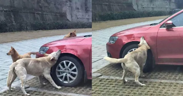 Ο οδηγός έλειπε όταν οι σκύλοι έπαιρναν την εκδίκηση τους, όμως ένας περαστικός που είδε την «μάχη» για την θέση από την αρχή ως το τέλος, φρόντισε να απαθανατίσει το απίθανο περιστατικό.
