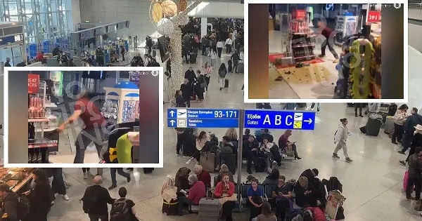 Μια εικόνα που κανείς δεν περιμένει να δει σε αεροδρόμιο –και μάλιστα σε ώρα αιχμής– εκτυλίχθηκε στο «Ελευθέριος Βενιζέλος», προκαλώντας αναστάτωση σε επιβάτες και εργαζόμενους. Σε χώρο καταστήματος Duty Free, άνδρας περίπου 40 ετών έχασε τον έλεγχο, άρπαξε γυάλινα μπουκάλια από ράφια και τα εκτόξευσε προς διάφορες κατευθύνσεις, την ώρα που δεκάδες άνθρωποι περνούσαν από το σημείο ή παρακολουθούσαν αποσβολωμένοι. Το επεισόδιο καταγράφηκε σε βίντεο που προβλήθηκε από το «Πρωινό» αποτυπώνει ένταση, φωνές και ζημιές, ενώ το περιστατικό κινητοποίησε άμεσα προσωπικό ασφαλείας και αστυνομικές δυνάμεις.