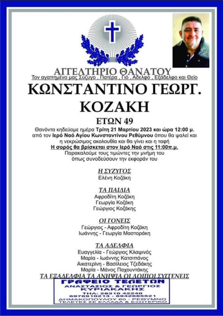 Πένθος στο Ρέθυμνο για τον ξαφνικό θάνατο του Κωνσταντίνου Κοζάκη, ο οποίος έφυγε από τη ζωή σε ηλικία 49 ετών, έχοντας αφήσει πίσω του 3 παιδιά. Ο άτυχος 49χρονος έχασε τη ζωή του απρόσμενα την Κυριακή (19/03) και σύμφωνα με πληροφορίες του Daynight.gr βρισκόταν σε φιλικό του σπίτι μαζί με την παρέα του, όπου και κατέρρευσε για άγνωστους μέχρι στιγμής λόγους.