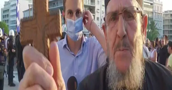 Πέρα από δυο κοπέλες που έστελναν… φιλάκια στην κάμερα και έκαναν μορφασμούς πίσω από τον ρεπόρτερ, ακούγονταν άνθρωποι να φωνάζουν «προδότες» προς το συνεργείου του σταθμού, ενώ ένας ιερέας με έναν σταυρό στο χέρι έκανε… παρέμβαση στην κάμερα λέγοντας τις δικές του απόψεις…