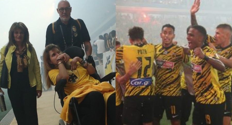 Η 23χρονη Μυρτώ, το κορίτσι που είχε συγκλονίσει το Πανελλήνιο όταν έμεινε ανάπηρη μετά από επίθεση Πακιστανού σε παραλία της Πάρου η οποία δεν μπορούσε να λείπει από την επιστροφή της αγαπημένης της ομάδας στην φυσική της έδρα.
