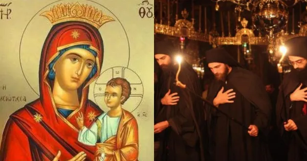 Και την στιγμή αυτή παρενέβη η Υπεραγία Θεοτόκος και υπενθύμισε στον Υιό Της, ότι αυτός ο πόρνος κληρικός καθημερινά Την χαιρέτιζε με τους Χαιρετισμούς Της, και μάλιστα και την στιγμή που τον παρέσυρε το ρέμα, τους Χαιρετισμούς Της είχε στα χείλη του. Έτσι κάμπτοντας τον Δικαιοκρίτη Κύριο μας κατάφερε να επιστρέψει η ψυχή του πόρνου κληρικού στο σώμα του, ώστε να μετανοήσει και να εξομολογηθεί, ώστε να σωθεί και να μην απολεστεί αιώνια.