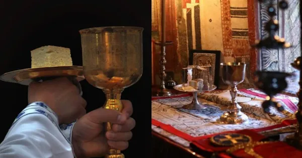 Στὴν μέση τῆς θείας Λειτουργίας, ὁ ἱερέας, λίγο πρὶν εὐλογήσει τὸν ἄρτο καὶ τὸν οἶνο γιὰ νὰ μεταβληθοῦν σὲ σῶμα καὶ αἷμα Χριστοῦ, ἐκφωνεῖ: