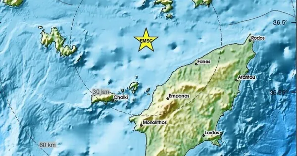 Συγκεκριμένα η εστία εντοπίζεται 12χιλιόμετρα δυτικά-νοτιοδυτικά της Σύμης, και το βάθος στα 5 χιλιόμετρα.