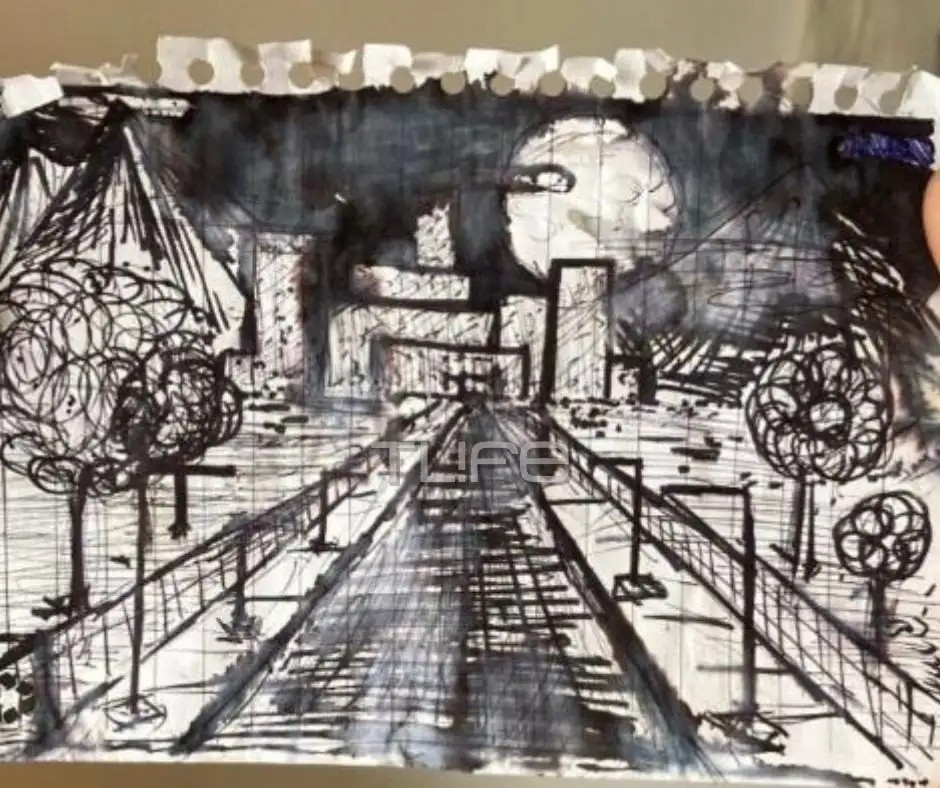 Όπως αναφέρει αποκλειστικά στο TLIFE ο πατέρας του Άγγελου, το σκίτσο αυτό ο γιος του το έκανε μέσα σε 20 λεπτά, σε καφέ που καθόταν πριν πάει στην δουλειά του και όπως μπορεί να παρατηρήσει κανείς, ο 23χρονος έχει σχεδιάσει ένα τούνελ, ράγες τρένου που χάνονται στο σκοτάδι, έναν ουρανό γεμάτο μαυρίλα και καπνούς, χωράφια απλωμένα δεξιά και αριστερά και στο κέντρο μια μορφή να περνά μπροστά από το φεγγάρι, σαν μια σκιά που βαδίζει προς το άγνωστο.