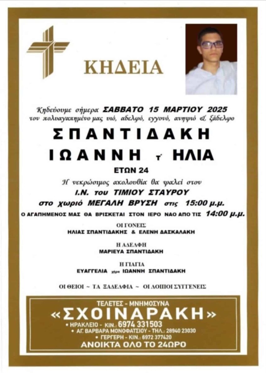 Πένθιμο κλίμα επικρατεί στο Ηράκλειο και στη Μεγάλη Βρύση, για τον θάνατο του νεαρού Γιάννη Σπαντιδάκη, ο οποίος «έσβησε» στην ηλικία των 24 ετών, μετά από πολύμηνη μάχη με σοβαρό πρόβλημα υγείας.