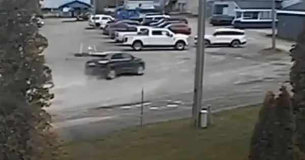 Βίντεο δείχνει το μπλε SUV της γυναίκας να περνάει με ταχύτητα μέσα από το πάρκινγκ του κλαμπ και να χτυπά τον πίσω τοίχο του κτιρίου.