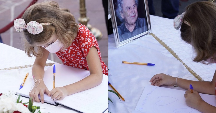 Η συγκίνηση κορυφώθηκε όταν έκανε την εμφάνισή του, το κορίτσι που βλέπετε στις επόμενες φωτογραφίες. Το παιδί μπήκε στον ιερό ναό. Αφησε ένα λουλούδι στο φέρετρο του μουσικοσυνθέτη και στο βιβλίο συλλυπητηρίων έγραψε: «Σε αγαπάμε φίλε μας». Ζωγραφίζοντας δύο μεγάλες καρδιές σύμφωνα με το cretalive.gr