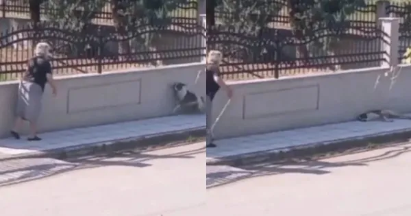 Μάλιστα ενώ βαδίζει με δυσκολία προτιμά να πετάξει το μπαστούνι και στήριγμα της για να χτυπήσει το σκυλάκι αντί να ενδιαφερθεί για τον εαυτό της που δεν μπορει να πάρει τα πόδια της.
