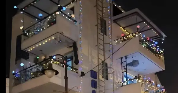 Πρόκειται για ένα βίντεο που δείχνει μια πολυκατοικία στις Συκιές Θεσσαλονίκης, η οποία είναι στολισμένη με χριστουγεννιάτικα λαμπιόνια από την κορυφή μέχρι τη βάση της – και όλα αυτά, ενώ βρισκόμαστε μόλις στις αρχές του Σεπτεμβρίου, περίπου 110 μέρες πριν τα Χριστούγεννα.