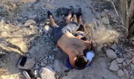Δραματικό βίντεο έδειξε τους διασώστες να προσγειώνονται και να βρίσκουν το ζευγάρι μαζεμένο μαζί σε μια ξερή κοίτη ρυακιού, με τον άνδρα να προστατεύει τη φίλη του από τον ήλιο και τον άνεμο με το σώμα του.