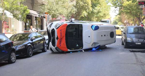 Μετά την ανατροπή του, το ασθενοφόρο έπεσε και τουλάχιστον σε ένα σταθμευμένο όχημα στο οποίο προκλήθηκαν υλικές ζημιές.