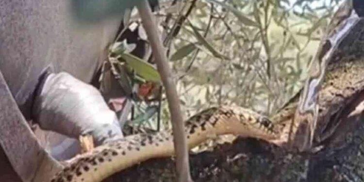 Ο άνδρας έριξε νερό με λάστιχο στο δέντρο πάνω στο οποίο ήταν η δεντρογαλιά. Το φίδι με μανία ήπιε το νερό δείχνοντας φανερά διψασμένο.