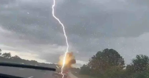 A woman in Florida captured the moment lighting struck the vehicle her husband and kids were in. The truck was "completely fried," but no one was hurt. pic.twitter.com/oePPFlcaJY
