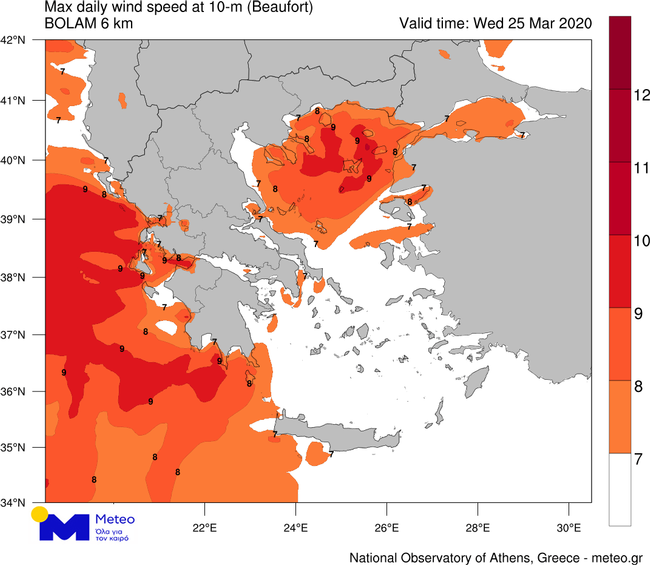 Παράλληλα, όπως φαίνεται στον προγνωστικό χάρτη που ακολουθεί, σημαντική ενίσχυση θα παρουσιάσουν από το βράδυ της Τετάρτης 25/03 οι βορειοανατολικοί άνεμοι στο Βόρειο Αιγαίο και οι ανατολικοί άνεμοι στο Ιόνιο, με τις εντάσεις τους να φτάνουν κατά περιόδους τοπικά τα 9 μποφόρ, διατηρούμενοι στα ίδια επίπεδα κατά τη διάρκεια της Πέμπτης 26/03.