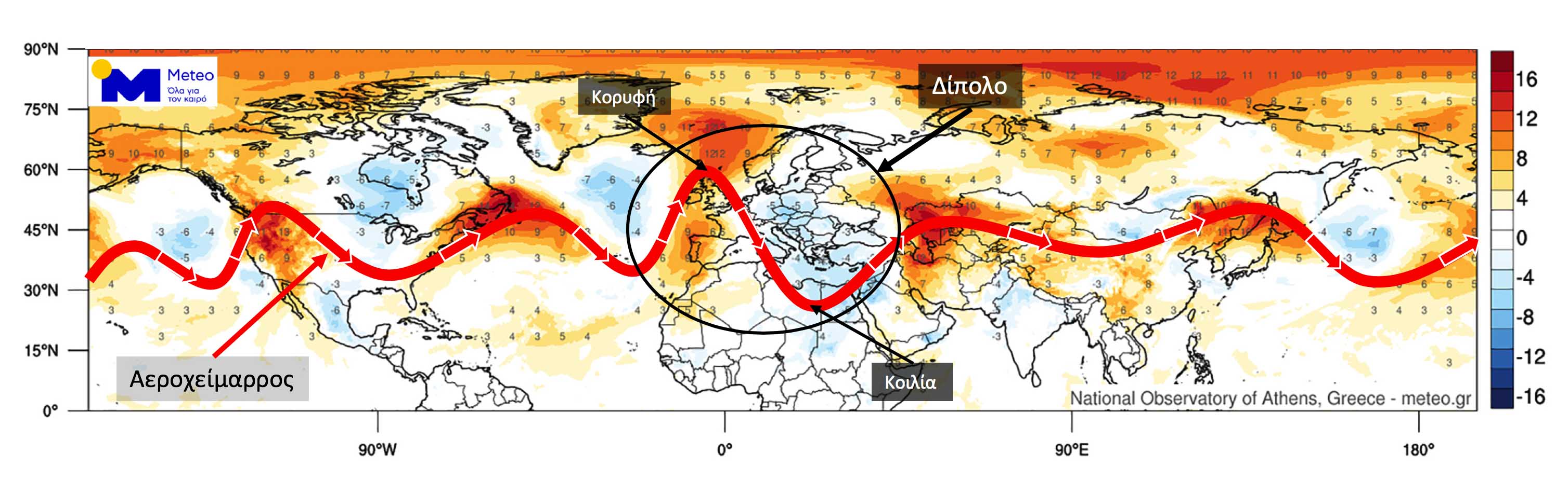 Ο επόμενος Χάρτης δείχνει την απόκλιση της θερμοκρασίας από τα κανονικά επίπεδα στα χαμηλά στρώματα της ατμόσφαιρας και τη θέση του πολικού αεροχειμάρρου (κόκκινη καμπύλη). Όπως διακρίνεται, τα πλανητικά ατμοφαιρικά κύματα που δημιουργούνται συνδέονται άμεσα με την μεταφορά θερμών (κορυφές κυμάτων) και ψυχρών αερίων μαζών (κοιλίες). Στην Ευρώπη η μεγάλη ταλάντωση των πλανητικών κυμάτων έχει δημιουργήσει ένα δίπολο ψυχρών και θερμών αερίων μαζών, με τις ψυχρές αέριες μάζες να έχουν μετακινηθεί πάνω από την περιοχή μας (γαλάζια χρώματα) ενώ θερμές αέριες μάζες καλύπτουν την Δυτική Ευρώπη (πορτοκαλί/κόκκινα χρώματα).