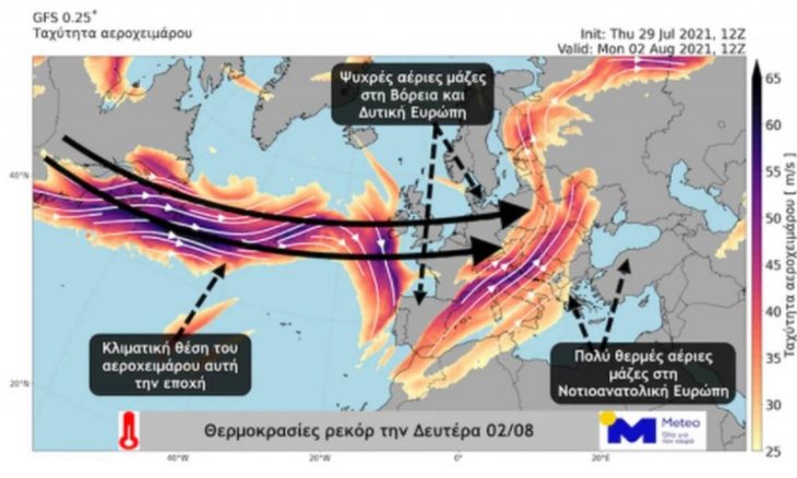 Ποιος είναι όμως ο λόγος που αυτό το κύμα καύσωνα έχει τόσο μεγάλη διάρκεια και συνοδεύεται από τόσο υψηλές θερμοκρασίες; Η απάντηση βρίσκεται 10 χιλιόμετρα πάνω από την επιφάνεια της γης και στην κίνηση του αεροχειμάρου. Ο αεροχείμαρος είναι ένα ισχυρό ρεύμα αέρα σε ύψος περίπου 10 χιλιομέτρων από την επιφάνεια της γης. Με κίνηση από τα δυτικά προς τα ανατολικά.
