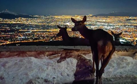 Ελάφι χαζεύει την φωτισμένη Αθήνα από τη χιονισμένη Πάρνηθα