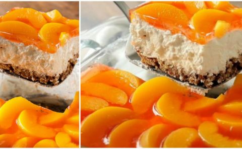 Γλυκό ψυγείου με βάση από μπισκότο και επικάλυψη από ροδάκινα και ζελέ