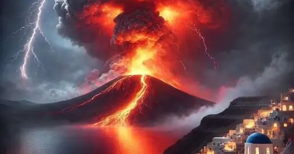 Ίσως το μόνο ηφαίστειο που η Καλντέρα του φθάνει μέχρι τη θάλασσα. Η μεγαλύτερή του έκρηξη συνέβη κατά την διάρκεια της Μινωική Εποχής του Χαλκού πριν από 3.600 χρόνια. Ολόκληρο το κέντρο του τότε κυκλικού νησιού βυθίστηκε στη θάλασσα κατά την διάρκεια της τρομερής ηφαιστειακής έκρηξης. Η έκρηξη προκάλεσε παλιρροιακό κύμα που κυριολεκτικά αφάνισε τον προηγμένο πολιτισμό της Μινωικής Κρήτης, 70 μίλια νότια της Σαντορίνης.