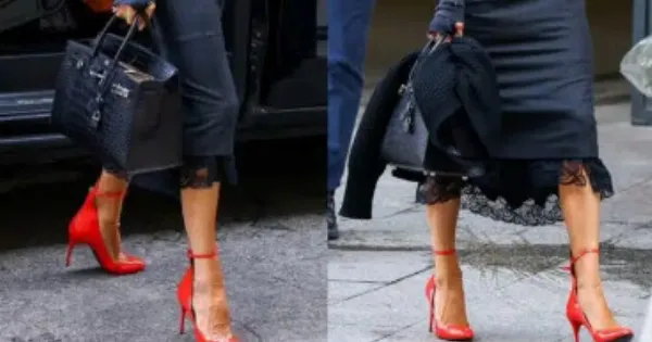 Ειδικότερα, η σύζυγος του Ντέιβιντ Μπέκαμ φόρεσε ένα φθαρμένο μακρυμάνικο τοπ Balenciaga, με λαιμόκοψη στολισμένη με δαντέλα και το συνδύασε με μια σκούρα γκρι φούστα με ρίγες και δαντελένιο φινίρισμα στο στρίφωμα, από τη συλλογή Καλοκαίρι 2024 τoυ ίδιου οίκου, ένα ζευγάρι πανύψηλες λουστρινένιες κόκκινες γόβες, που είχα δύο λεπτεπίλεπτα λουράκια με αλυσίδα στους αστραγάλους από τον Alaïa, μια Hermès Birkin Sellier 25 από μαύρο ματ δέρμα αλιγάτορα, η οποία κοστίζει 82.500 δολάρια και ένα ζευγάρι μεγάλα μαύρα γυαλιά ηλίου από τη δική της σειρά.
