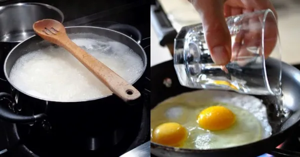 13) Σπάστε τα αυγά σας σε ένα τηγάνι και ρίξτε λίγο νερό. Τα αυγά σας θα βγουν τέλεια.
