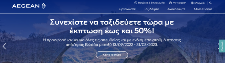 Έκπτωση 50% εφαρμόζεται στις πτήσεις μεταξύ 9 Ιανουαρίου έως 23 Φεβρουαρίου 2023, 1η έως 23 Μαρτίου 2023 και από 28 έως 31 Μαρτίου 2023. Η προσφορά ισχύει για όλες τις απευθείας και με ενδιάμεσο σταθμό πτήσεις από/προς Ελλάδα προς/από όλους τους προορισμούς εξωτερικού, με απλή μετάβαση και με επιστροφή, με εξαίρεση προορισμούς όπως Τζέντα, Τύνιδα, Ριάντ, Πάρος, Νάξος και Μήλος.