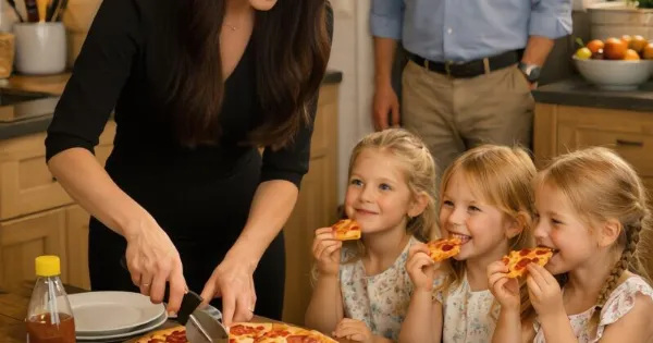 Οι τρεις κόρες του ήταν γύρω από το τραπέζι, με τα χέρια γεμάτα αλεύρι, προσπαθώντας άτσαλα να πλάσουν ζύμη. Δίπλα τους… η Clara, χαμογελαστή και λαμπερή, τους μάθαινε κάτι.