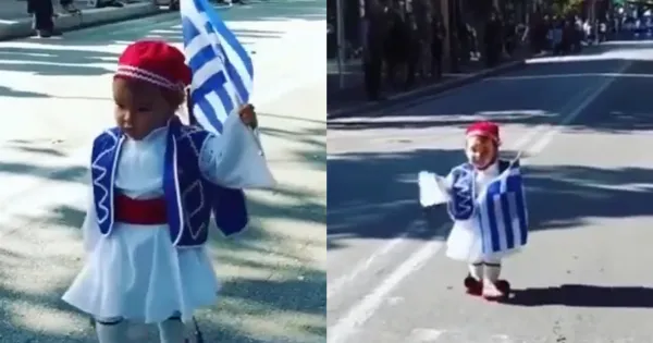Ο μικρός χαριτώμενος εύζωνας γοήτευσε τους πάντες με τον ενθουσιασμό του στην παρέλαση. Κρατώντας μια ελληνική σημαία και ντυμένος Εύζωνας, το μικρό παιδάκι έκλεψε τις εντυπώσεις.