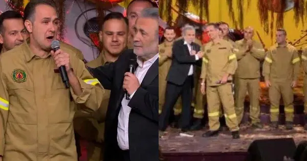 Οι εποχικοί πυροσβέστες που ανέβηκαν στη σκηνή χειροκροτήθηκαν από το κοινό και στη συνέχεια ο επικεφαλής Θάνος Ψαρόπουλος πήρε τον λόγο και είπε πως «οι ήρωες δεν φοράνε μπέρτες, οι ήρωες φοράνε μπλε και μπεζ στολές».