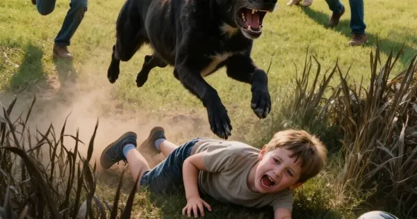 Πριν προλάβω να φωνάξω, ο σκύλος είχε ήδη καλύψει την απόσταση. Καμία γάβγιση. Καμία γρύλισμα. Έπεσε πάνω στο γιο μου.