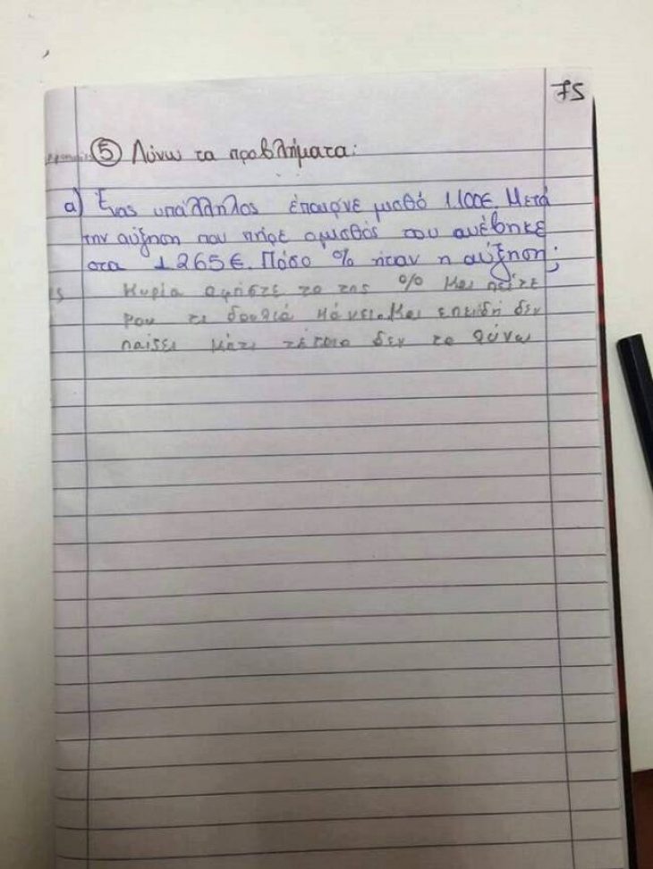 Ο μαθητής δίνει μια αξιολάτρευτη και άκρως ώριμη και ρεαλιστική απάντηση γράφοντας ότι δεν λύνει το πρόβλημα εάν δεν του πουν τι δουλεία κάνει αυτός ο υπάλληλος!