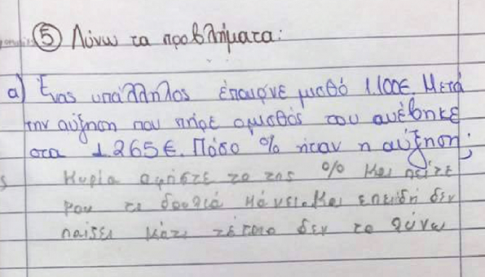 Ο μαθητής δίνει μια αξιολάτρευτη και άκρως ώριμη και ρεαλιστική απάντηση γράφοντας ότι δεν λύνει το πρόβλημα εάν δεν του πουν τι δουλεία κάνει αυτός ο υπάλληλος!