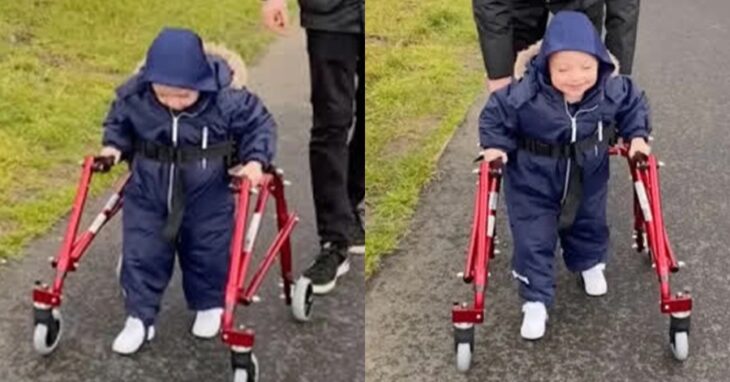 Αυτές είναι η συγκινητικές στιγμές που το αγόρι κάνει τα πρώτα βήματα της ζωής του, με τη βοήθεια μιας ειδική περπατούρας.