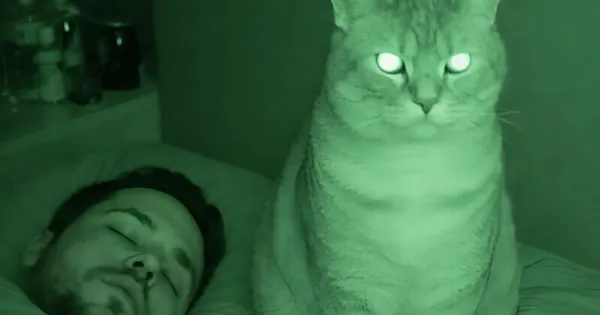 Αλλά πώς να παρακολουθήσεις μια γάτα τη νύχτα, όταν κοιμόμαστε; Δεν είχα άλλη επιλογή και έβαλα μια κάμερα νυχτερινής όρασης στο υπνοδωμάτιο, στραμμένη κατευθείαν προς το κρεβάτι μας.