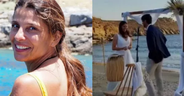 Το απόγευμα του Σαββάτου δίπλα στη θάλασσα έγινε το μυστήριο με συγγενείς και φίλους να δίνουν το «παρών». Μετά το γάμο ακολούθησε γαμήλιο πάρτι στην αμμουδιά με το ζευγάρι να μη σταματάει το ξέφρενο χορό.