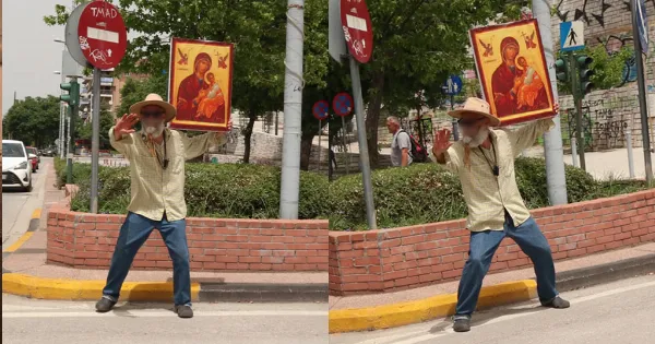 Προκάλεσε εντύπωση και κέρδισε τα βλέμματα των περαστικών. Και αυτό οφείλεται στο γεγονός ότι κρατούσε μία μεγάλη εικόνα της Παναγίας. Ενώ βρέθηκε σε πολλά κεντρικά σημεία… κερδίζοντας τα βλέμματα των περαστικών!