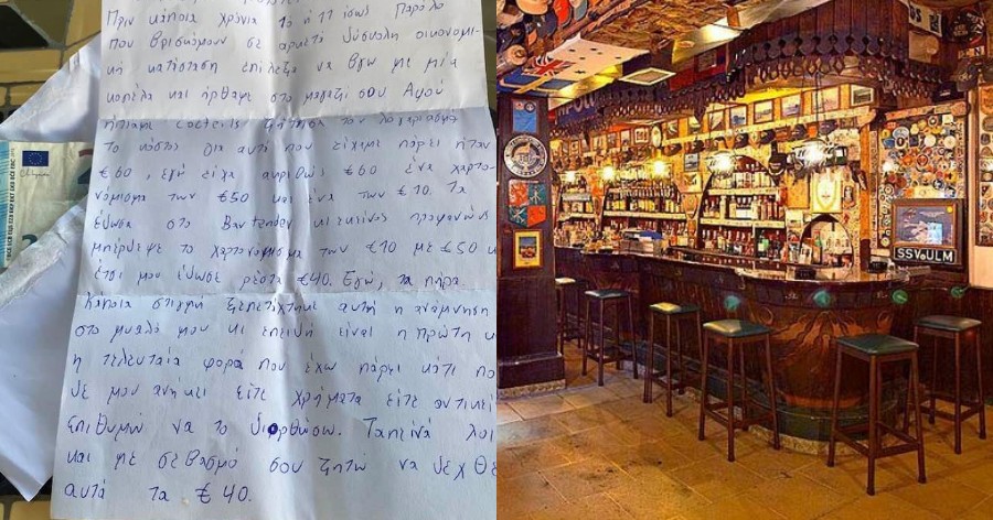 Άφωνοι έμειναν οι ιδιοκτήτες του μπαρ στα Χανιά διαβάζοντας το γράμμα που τους έστειλε ένας Κρητικός, ζητώντας συγγνώμη και επιστρέφοντας 40 ευρώ.