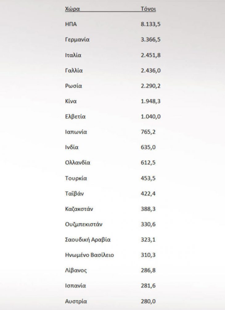 Αν αναρωτιέσαι πού βρίσκεται η χώρα μας στη σχετική λίστα, σας ενημερώνουμε ότι φιγουράρουμε στην 33η θέση. Να επισημανθεί επίσης ότι οι κεντρικές τράπεζες των περισσότερων μεγάλων κρατών δεν έχουν επιτρέψει την διεξαγωγή ανεξάρτητων ελέγχων στα αποθεματικά τους. Αυτό σημαίνει ότι μπορεί να υπάρχουν κι άλλοι τόνοι αδήλωτοι. Μάλιστα, το ακριβές βάρος είναι άγνωστο.