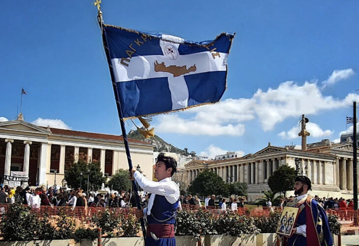 Ο ηθοποιός παρέλασε με παραδοσιακή ενδυμασία της γενέτειρας του, Κρήτης και κρατώντας στα χέρια του τη σημαία της Παγκρητίου Ενώσεως.